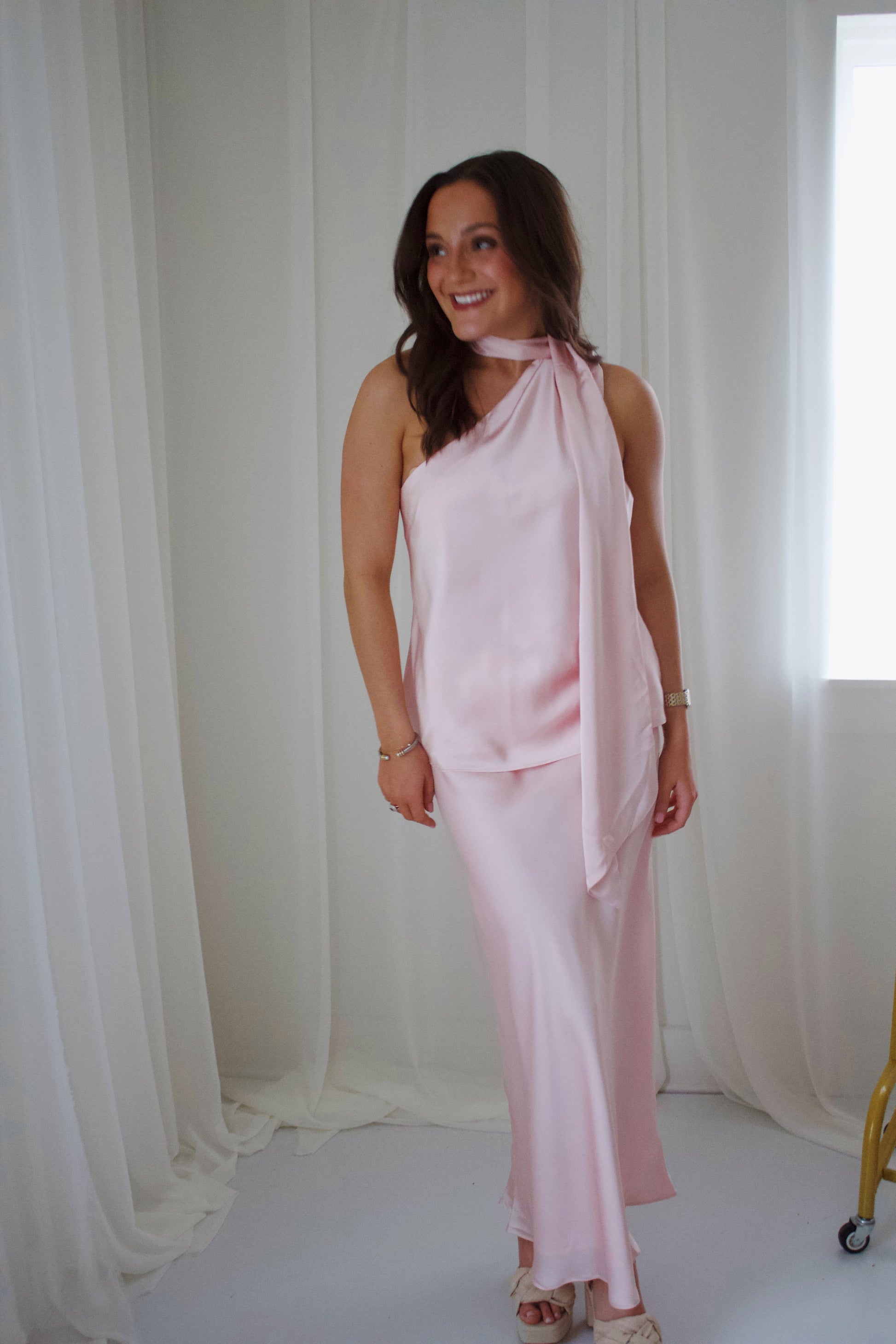 It's hard not to fall in love with this beautiful satin two-piece. With multiple ways to style, this set is a go-to for all your spring formalities. Our favorite part is the backless detail - style it with the scarf draped in front, tucked behind, or buttoned into a half bow.