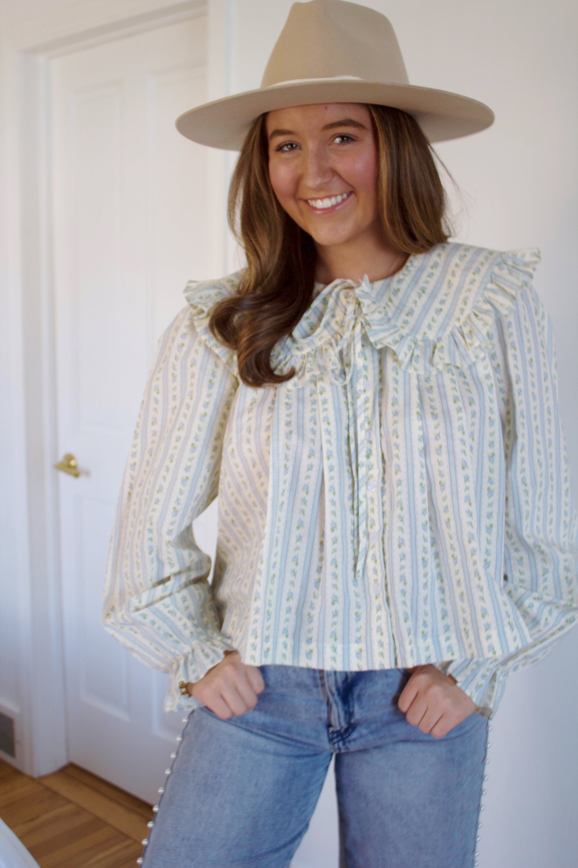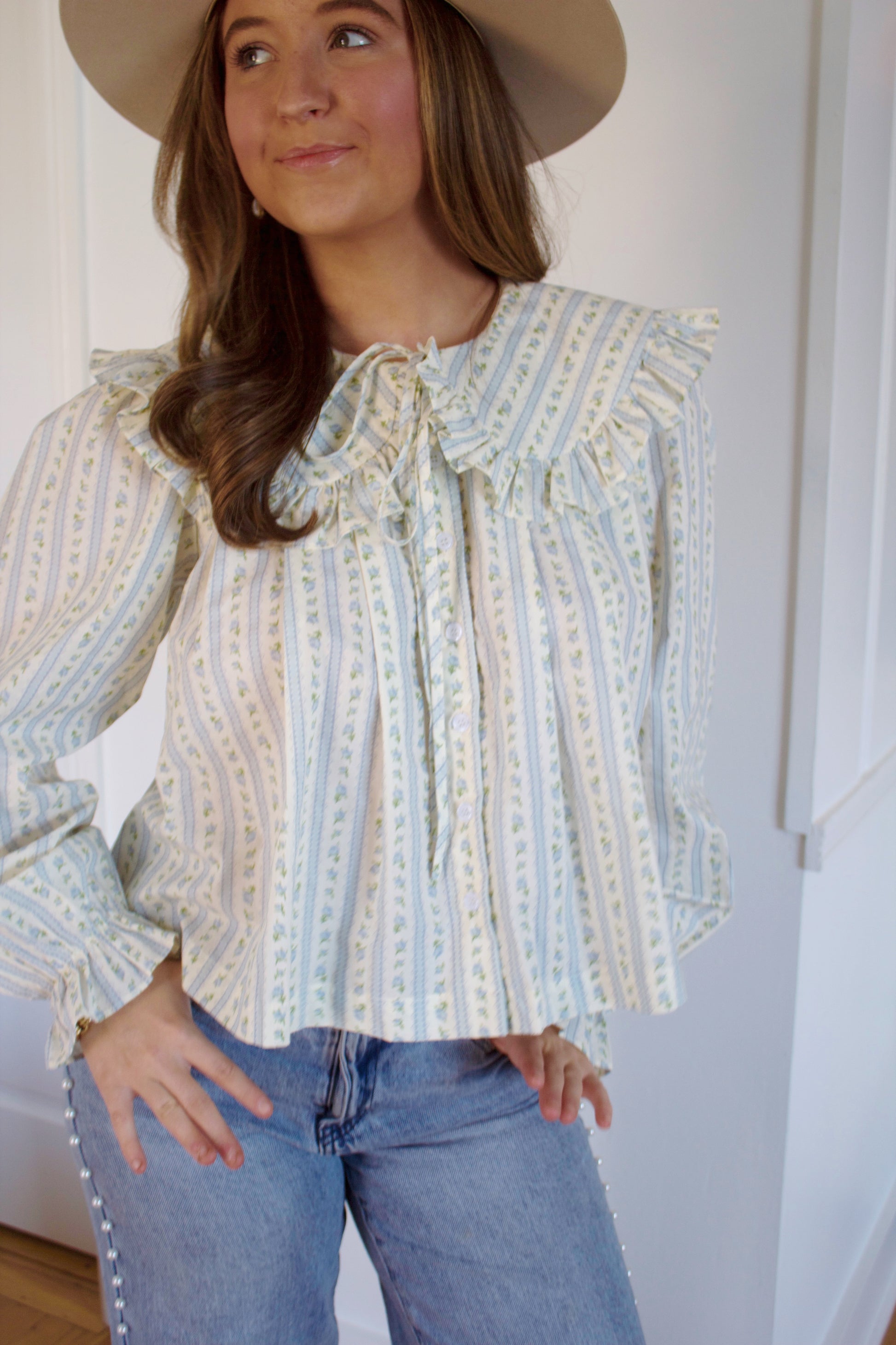 This is the top you'll want on repeat all season long! Lightweight, feminine, and fun! With the block print pattern and peter pan collar, what's not to love?!
