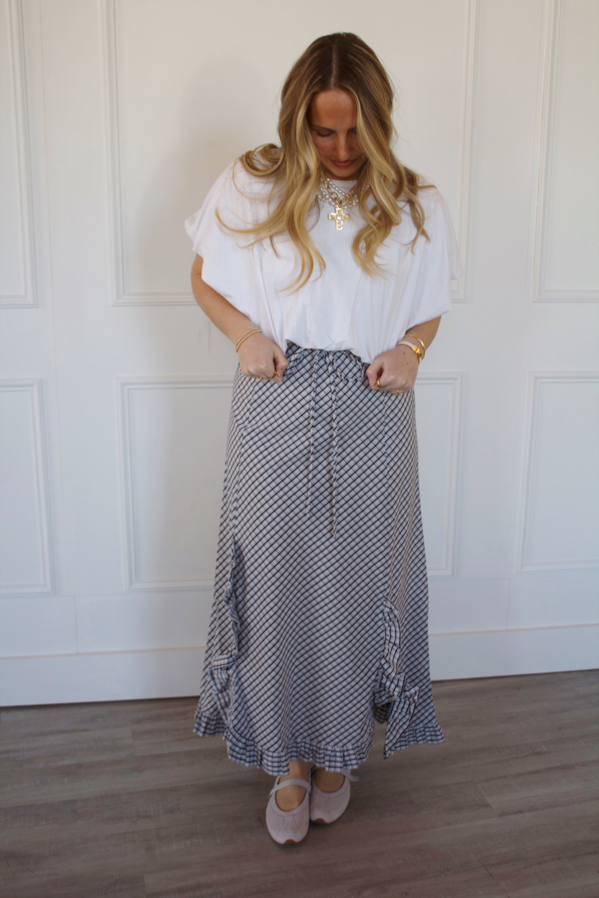 Such a cute, lightweight transitional maxi skirt! This cotton skirt is TTS featuring a tie adjustable waist. We love the ruffle details & the plaid pattern on this maxi.