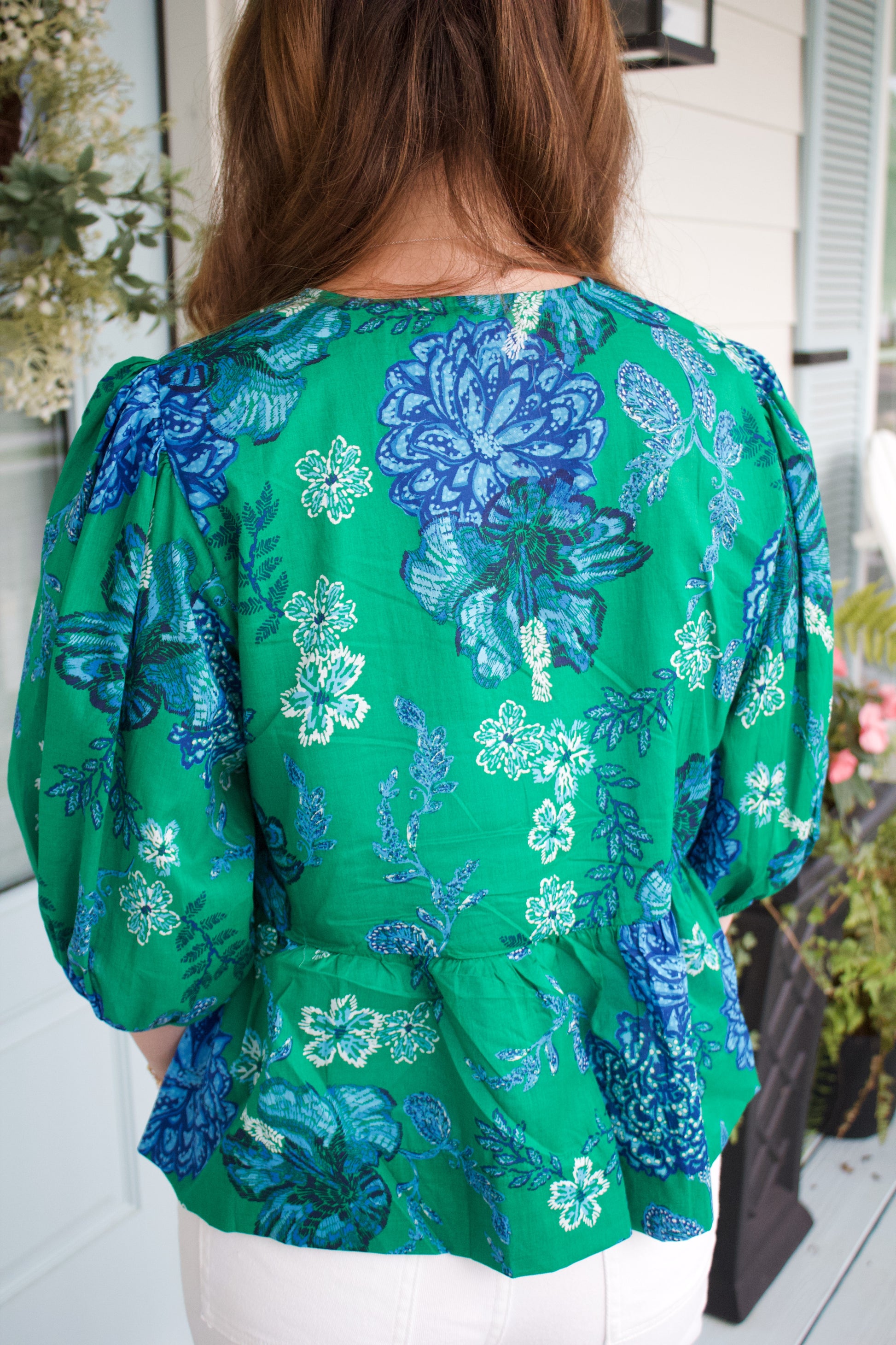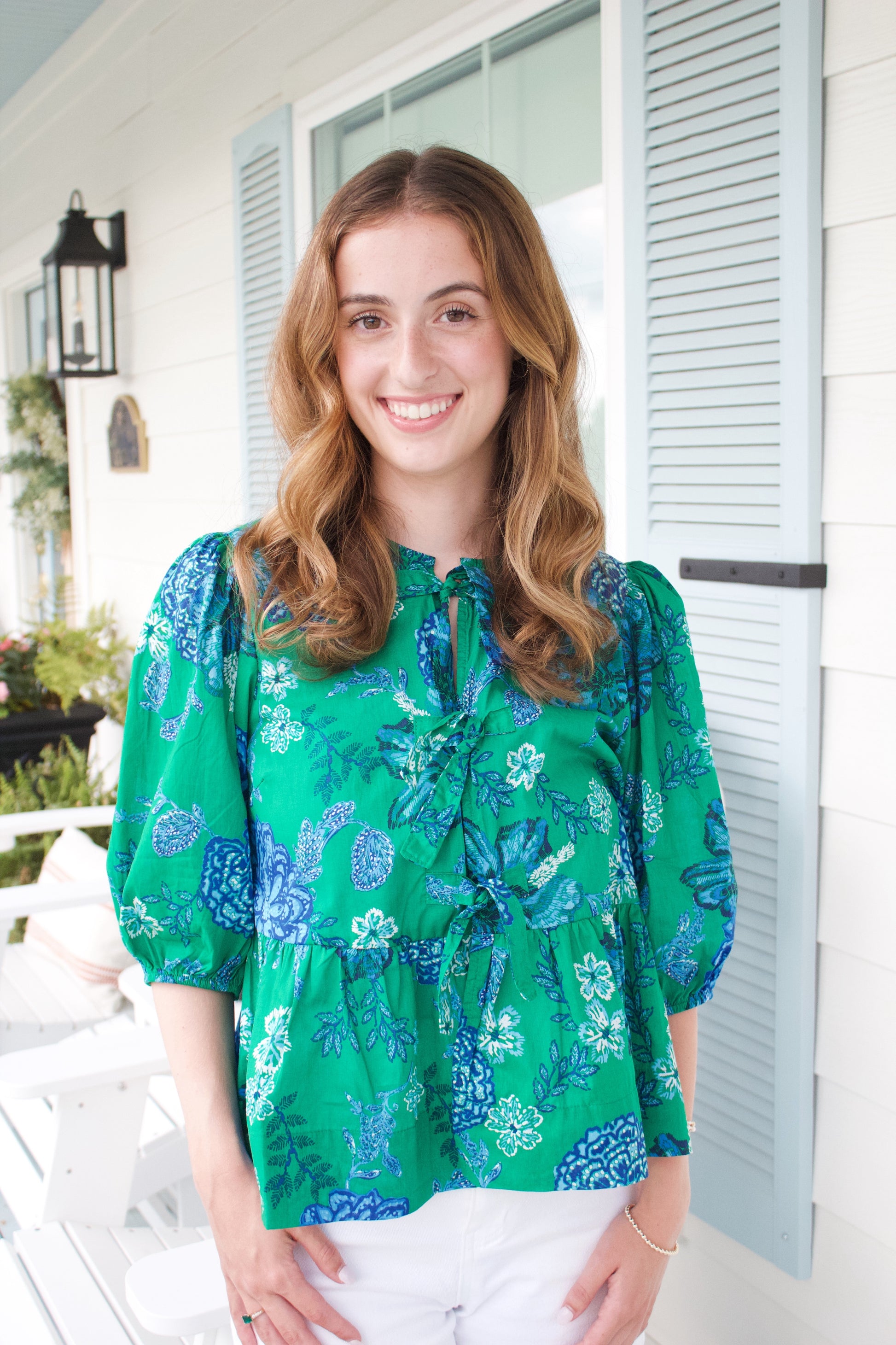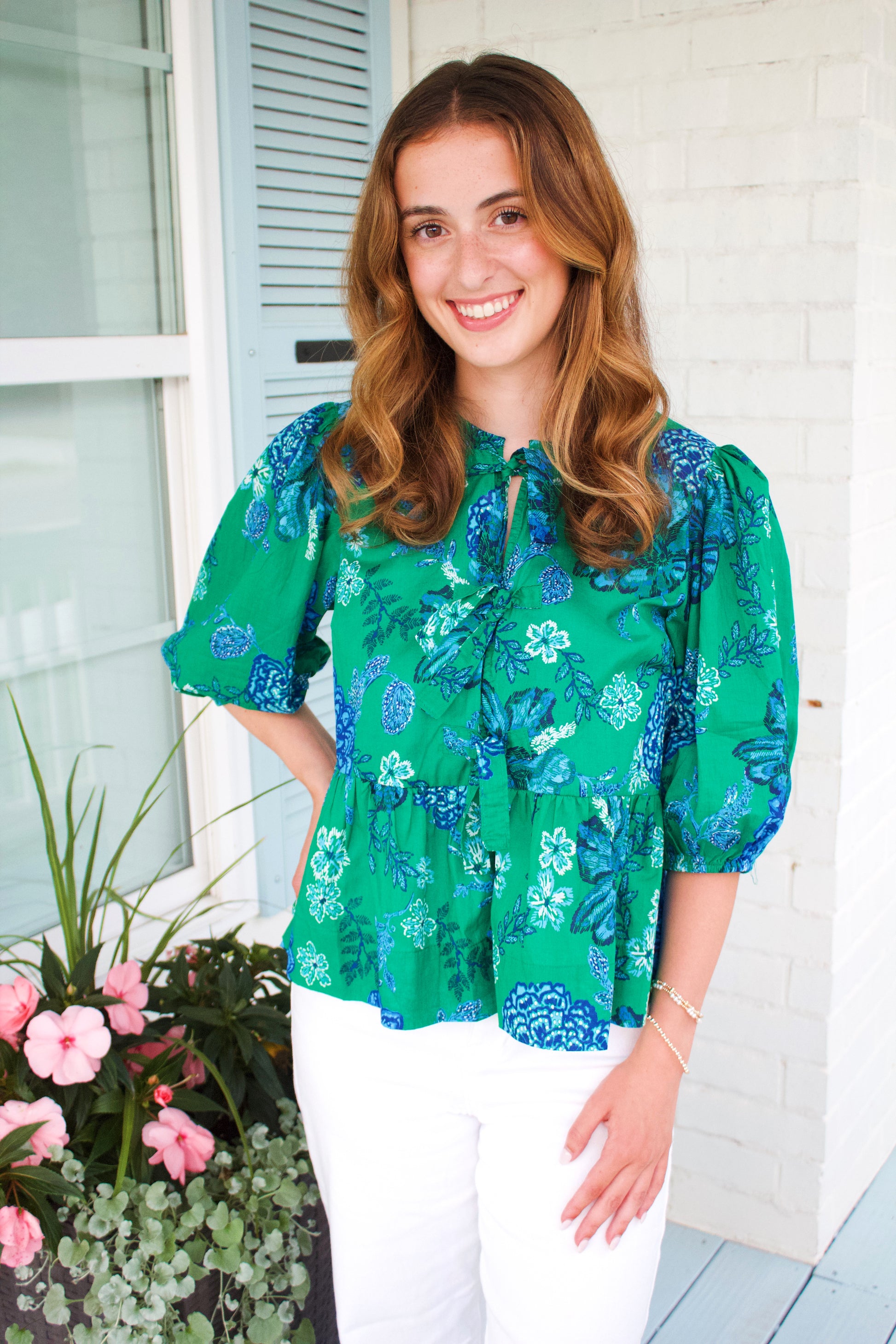 The most perfect green and blue tie-peplum blouse! The Olivia Grace Patterned Tie Top has puff sleeves, is 100% light and breathable cotton, and features the classic tie structure.