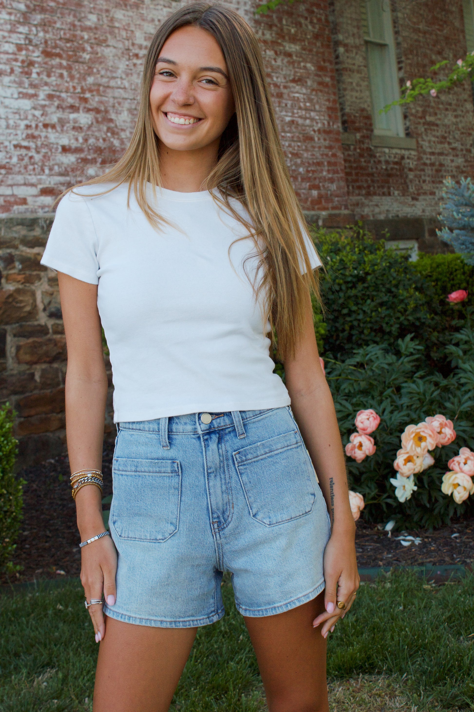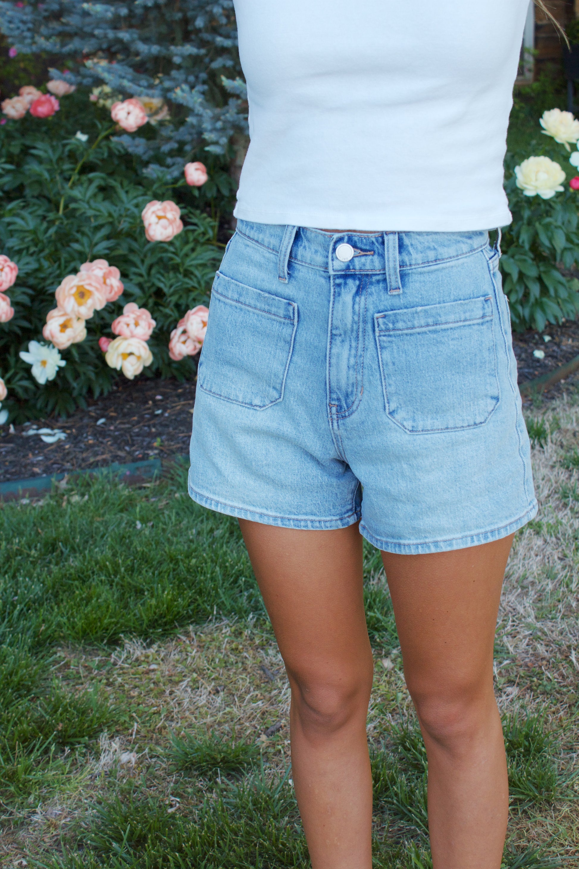 Light wash denim parch pocket shorts. The ideal length for every activity!