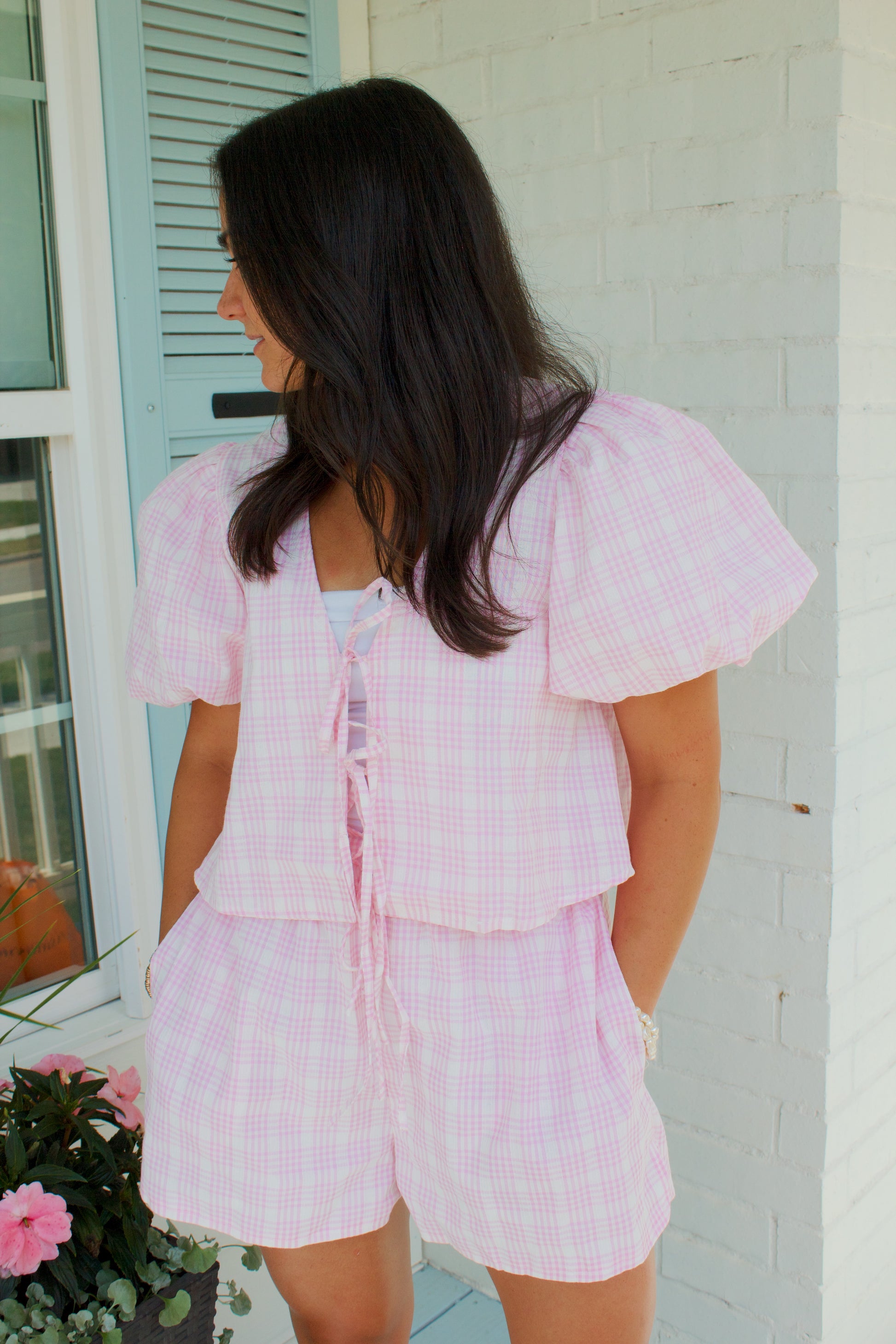 This pink plaid pattern is so fun! With elastic shorts and a classic puff sleeve top, wear this set together or separate for endless outfits this summer!