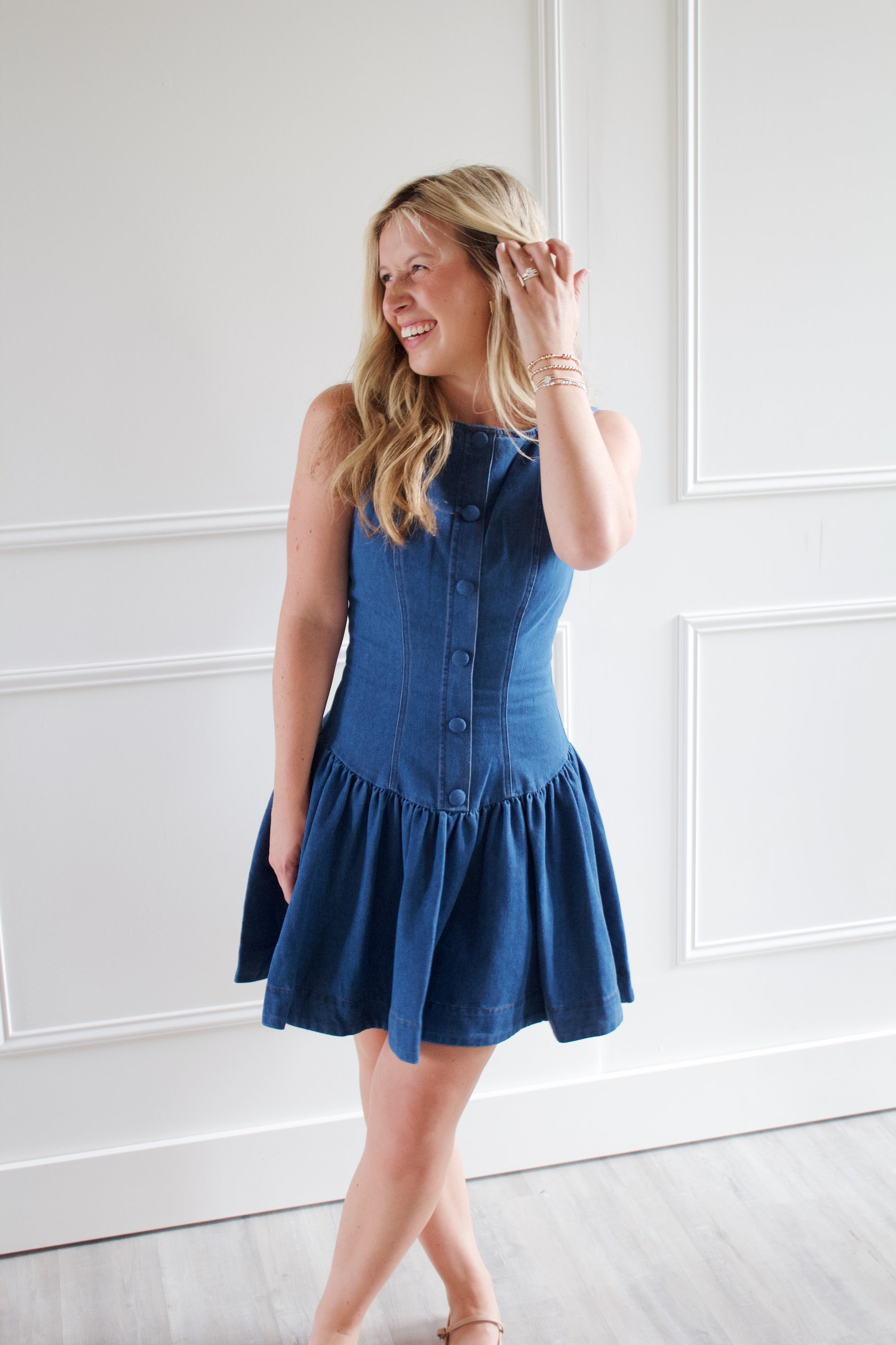 the cutest drop waist denim buttoned dress! You need this in your closet for game day & every fall occasion.
